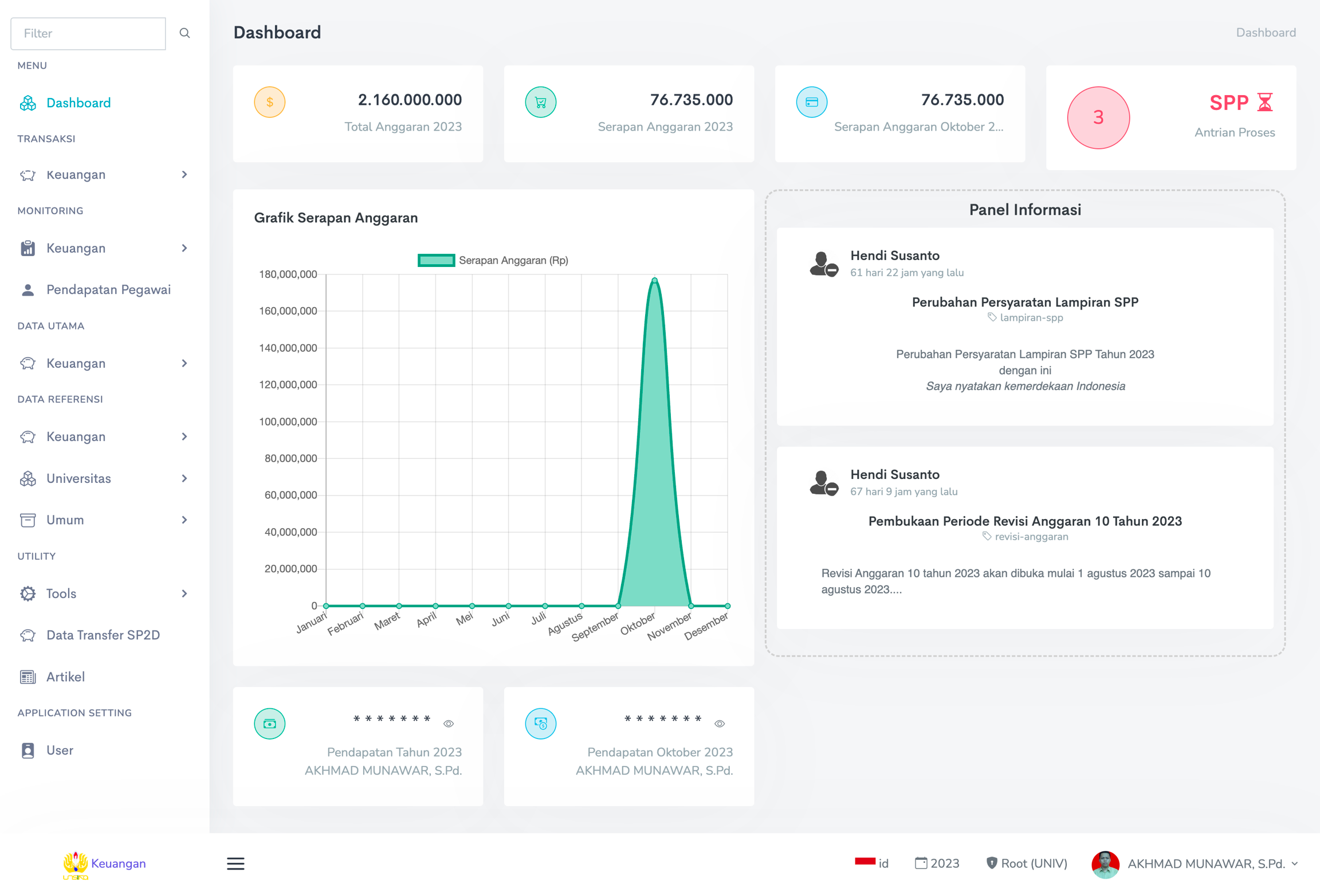 Di halaman utama dashboard terdapat menu ringkasan anggaran tahun berjalan, penggunaan anggaran tahunan, penggunaan anggaran bulanan, serta pendapatan per pegawai dan pendapatan pegawai setiap bulan.