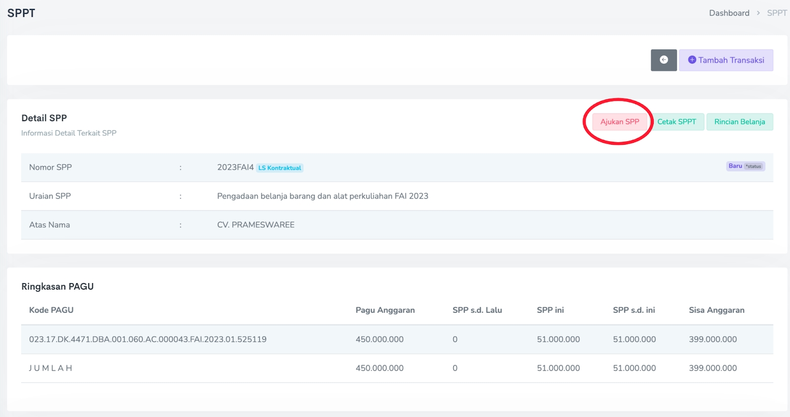Setelah dokumen yang diminta di upload, silahkan klik kembali dan Klik Extra → Transaksi → Ajukan SPP → Konfirmasi Pengajuan SPP ke Penguji.