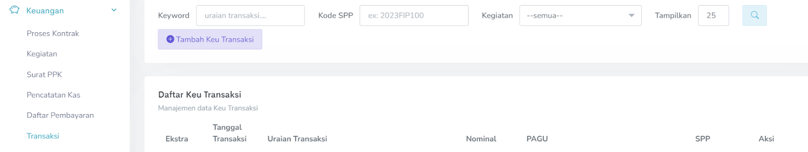 Masuk ke Menu Transaksi → Keuangan → Transaksi seperti gambar di bawah ini.