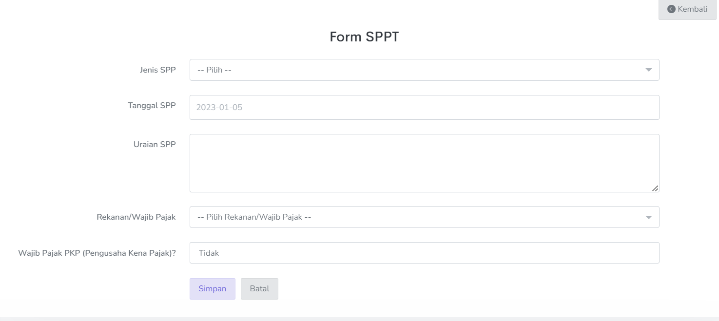 Setelah Klik Tambah SPPT → Isi Data SPP yang dibutuhkan, untuk jenis SPP silahkan pilih Uang Persediaan (UP) dan klik Simpan.