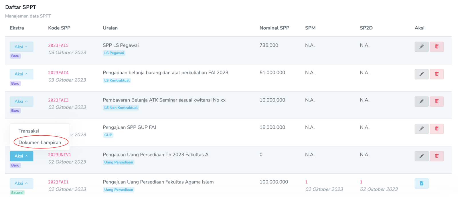Setelah Dokumen SPP dan SPTJB (Surat Pernyataan Tanggungjawab Belanja) di cetak dan dimintakan tanda tangan oleh Pejabat terkait silahkan di scan untuk pengajuan SPP secara online dalam sistem. Menu upload dokumen sebelum diajukan ada di Ekstra → Aksi → Dokumen Lampiran → Tambah Dokumen → Upload Dokumen yang sesuai yang diminta.