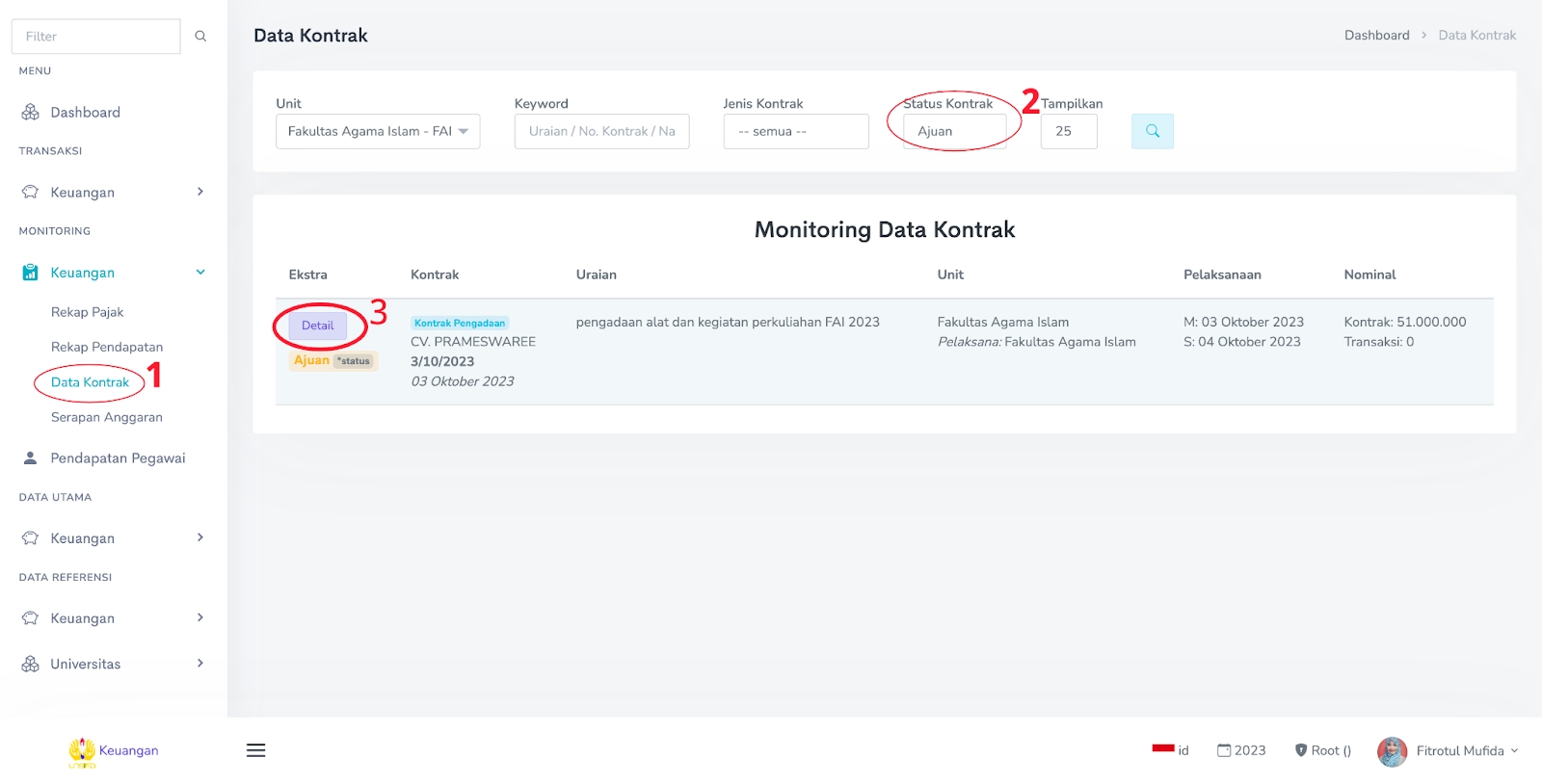 Setelah itu, silahkan filter status kontrak dan klik search → Detail