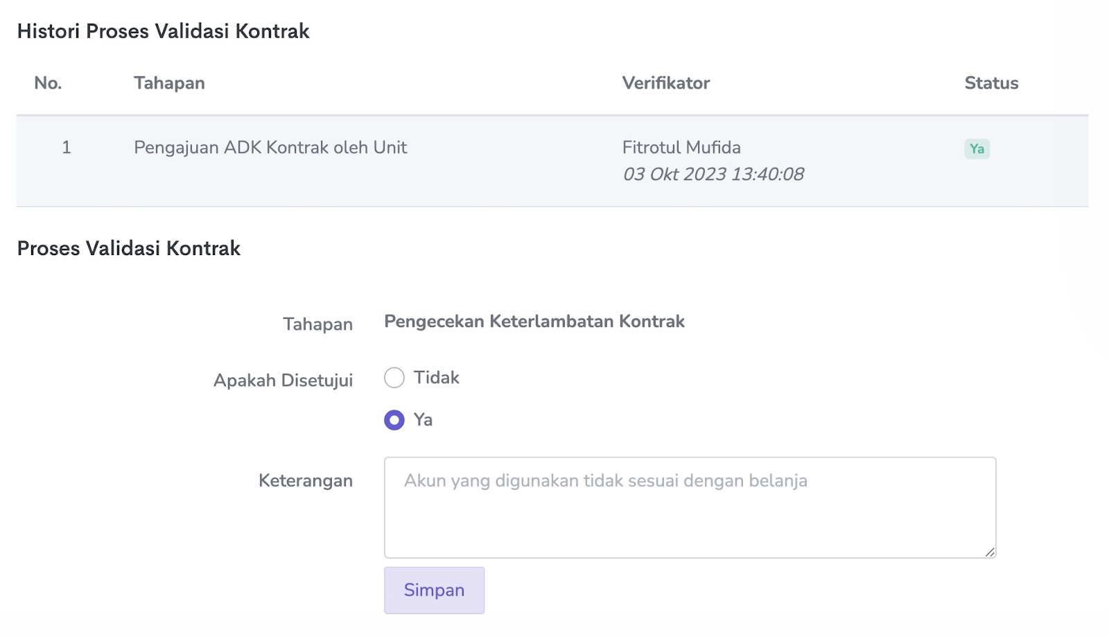 Jika semua dokumen yang telah di upload oleh unit kerja telah sesuai silahkan Validasi ADK Kontrak dan Klik “Simpan”